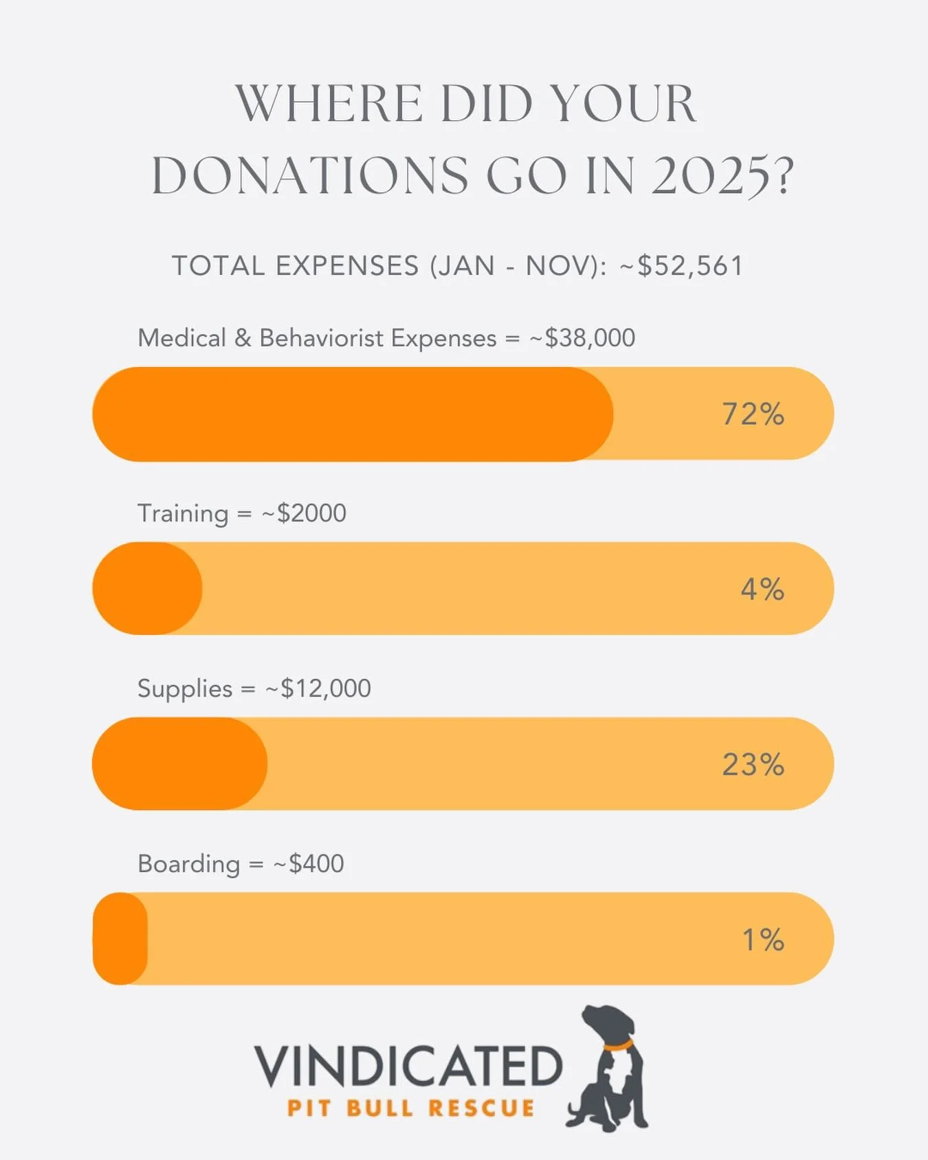 We are a 501c3 nonprofit and our programs are geared to help eliminate overpopulation and the euthanasia of adoptable dogs through innovative solutions while combatting breed stereotypes. May our Vindicated dogs be the examples of how wonderful "pit bull" type dogs can really be.